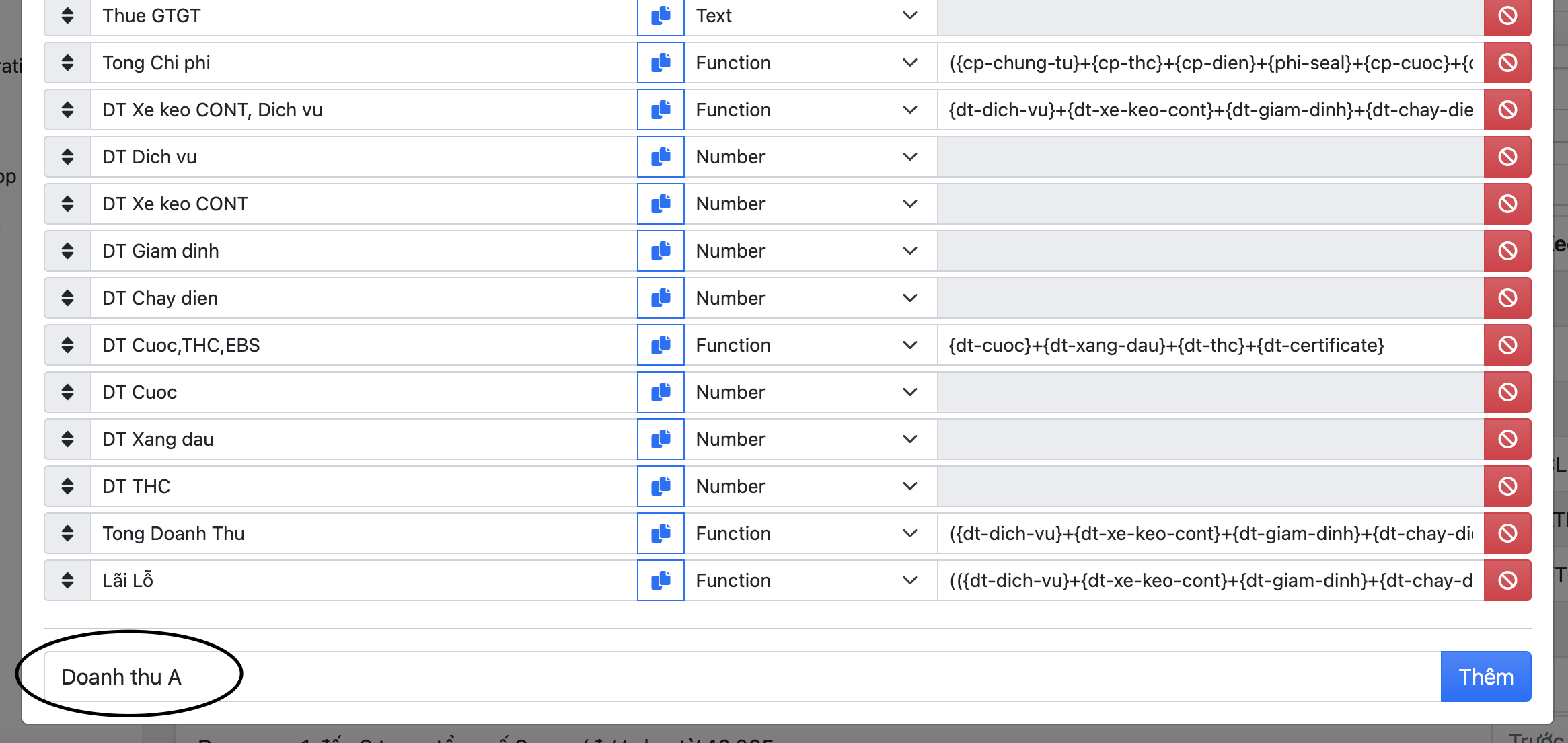Tên cột-> Nhập tên cột cần tạo mới -> NhấnThêmđể tạo cột mới - Sau khi các cột mới được thêm vào, người dùng có thể cập nhật loại dữ liệu của cột cũng như vị trí, hàm của cột…