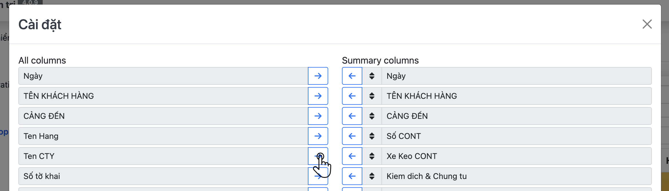 Cài đặt - Tại popup mở ra, bên trái là tất cả các cột dữ liệu, bên phải là các cột dữ liệu tổng hợp