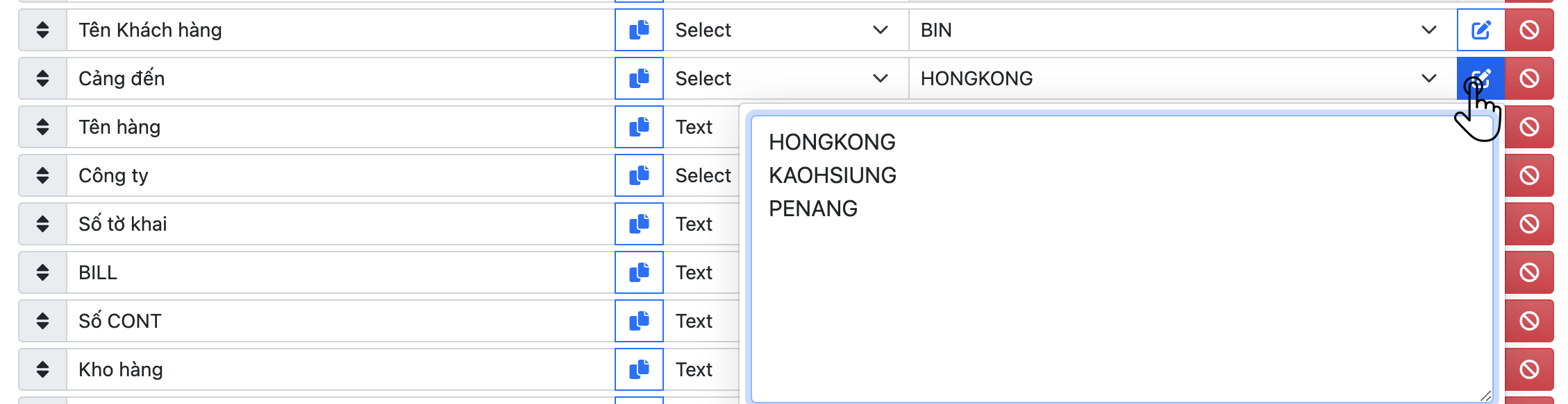 - Để cài đặt dữ liệu cột là danh sách chọn, chọn loại dữ liệu cho cột là