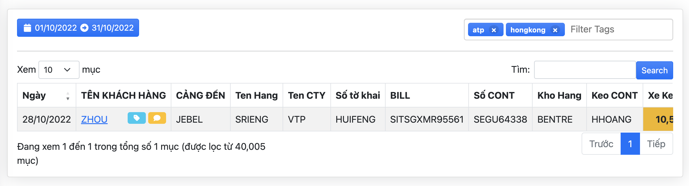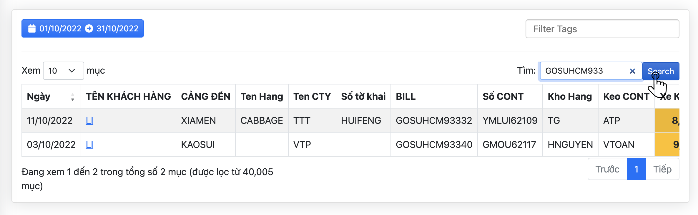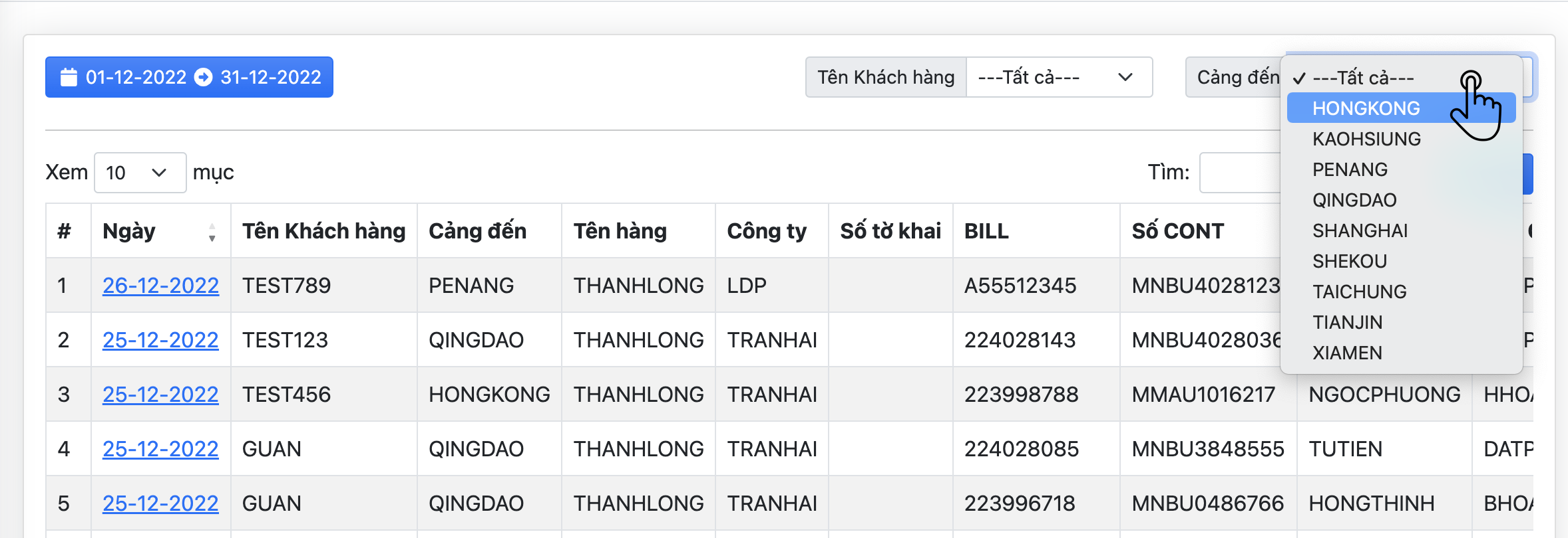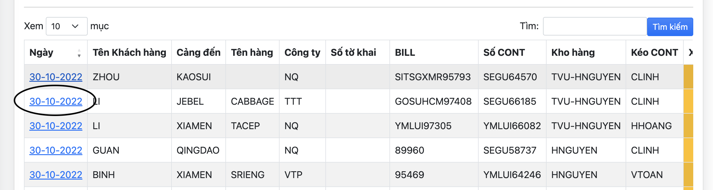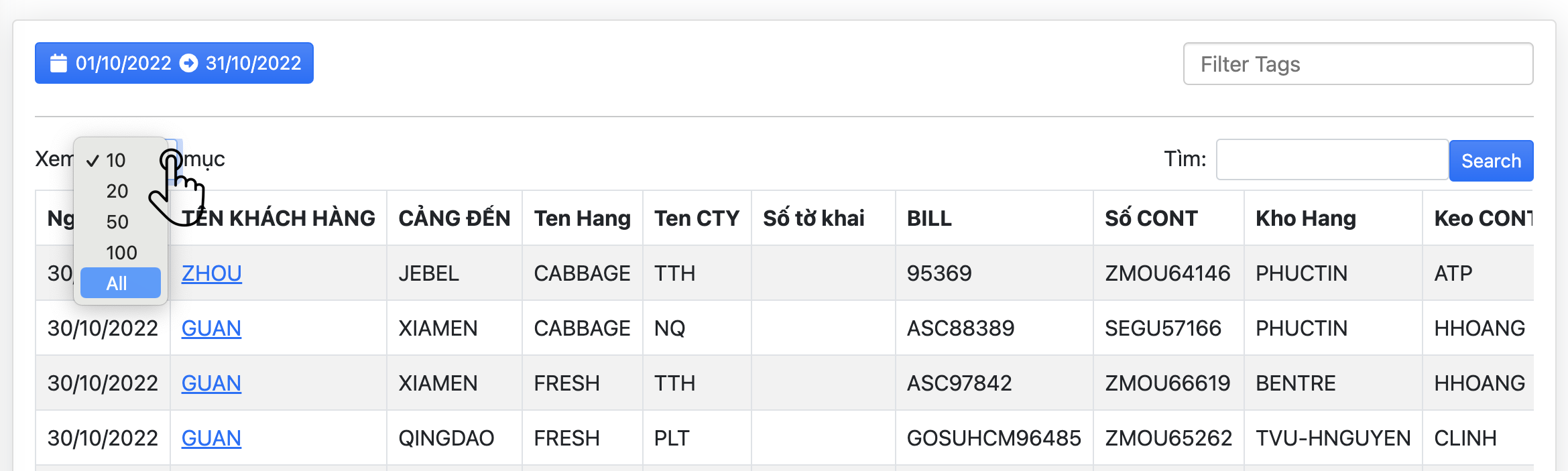 - Mặc định khi tải trang dữ liệu, số dòng hiển thị là 10