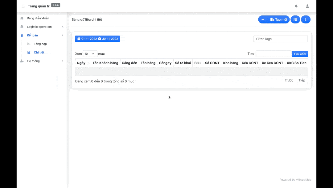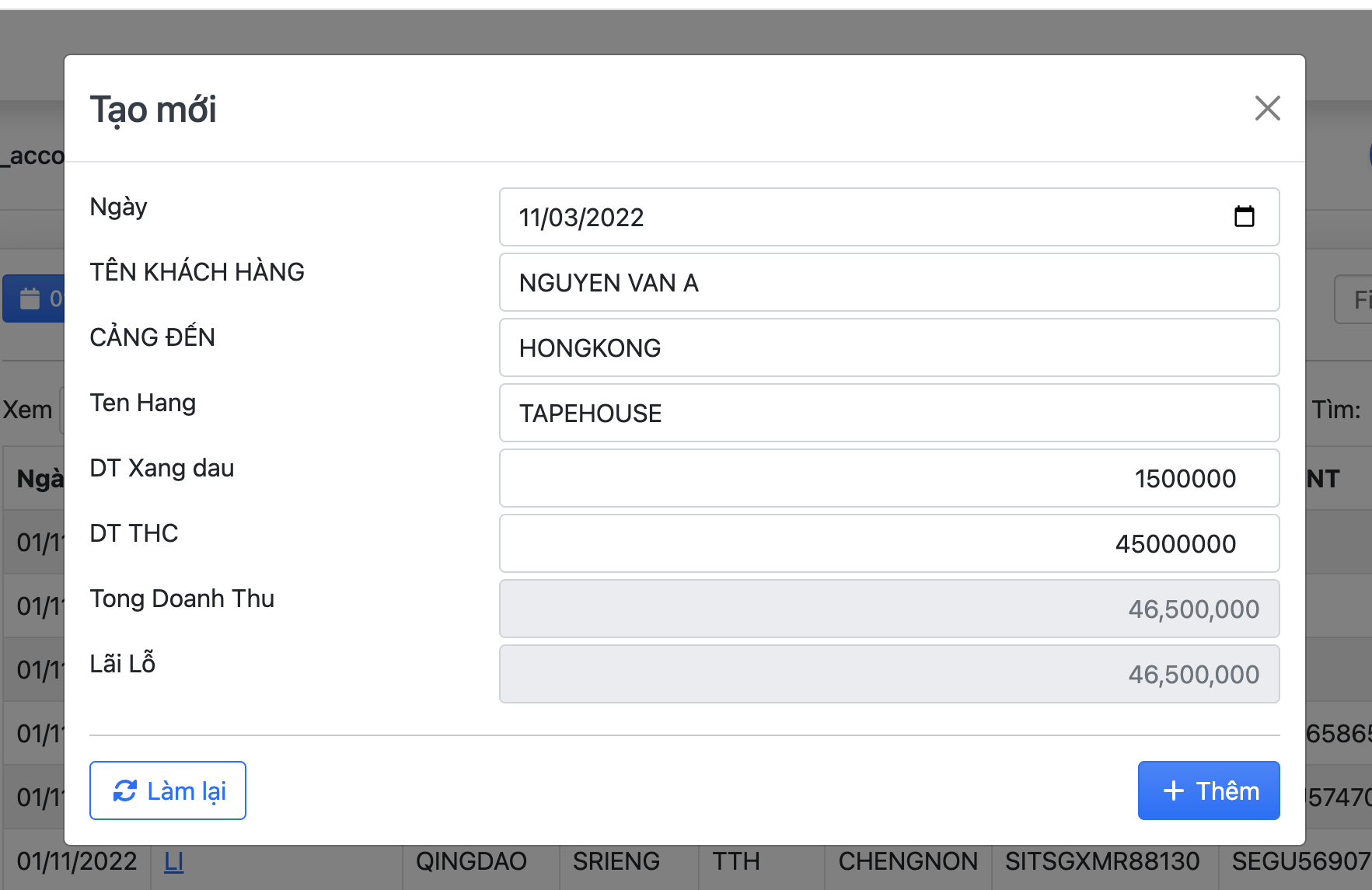 Tạo mới] - Popup tạo mới dữ liệu hiện ra, nhập các trường dữ liệu