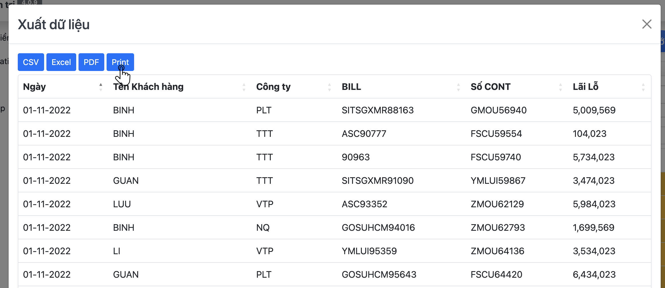 Xuất dữ liệu - Một popup sẽ hiện ra với bảng dữ liệu xem trước