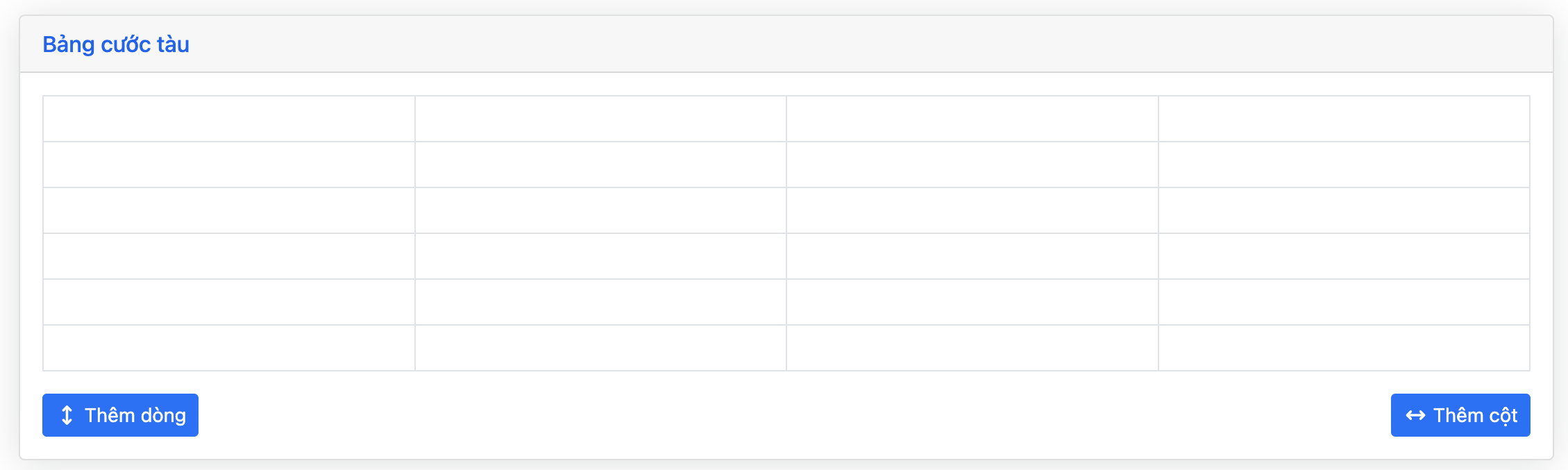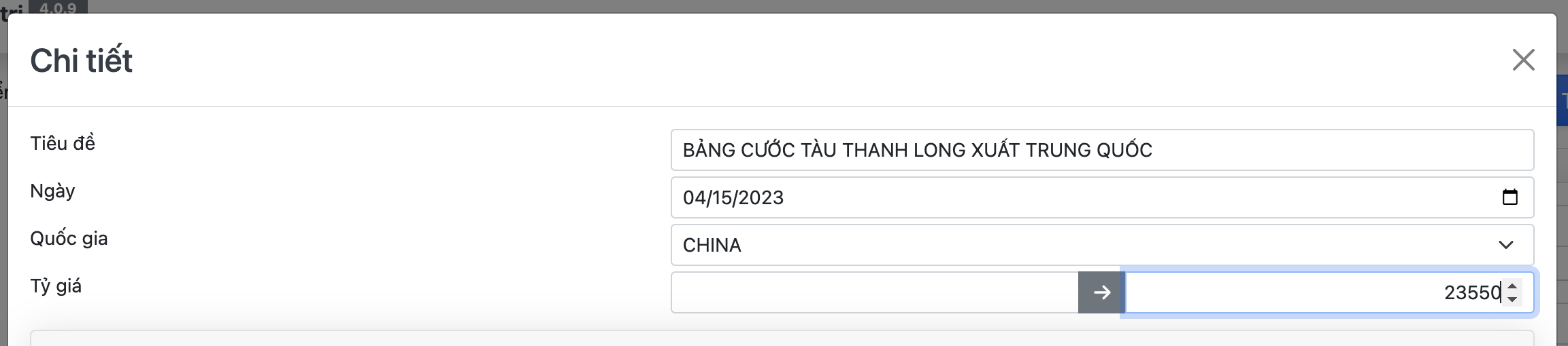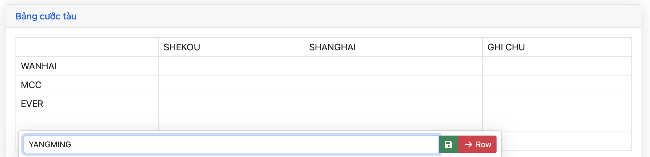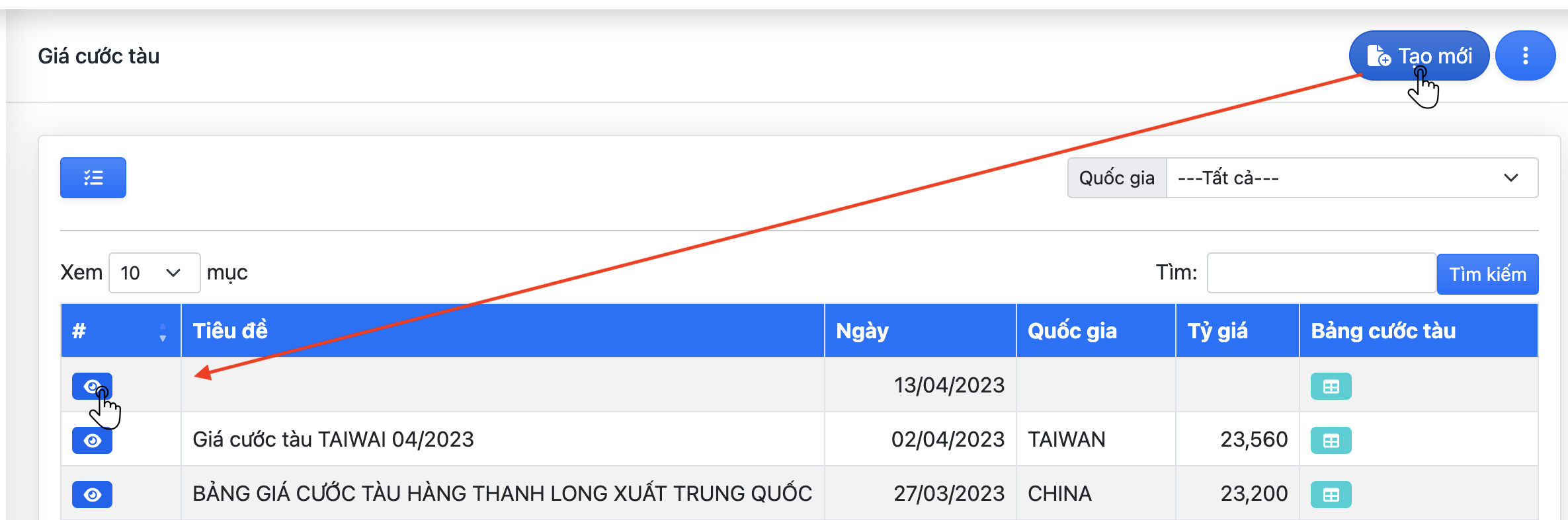 Giá cước tàu, nhấn nút [Tạo mới] ở góc trên bên phải -> Một dòng dữ liệu mới sẽ được thêm vào danh sách - Từ danh sách của