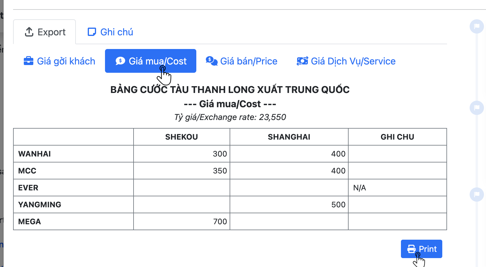 - Nhập Giá mua (Cost) tương ứng với các cảng đến (POD) trên bảng